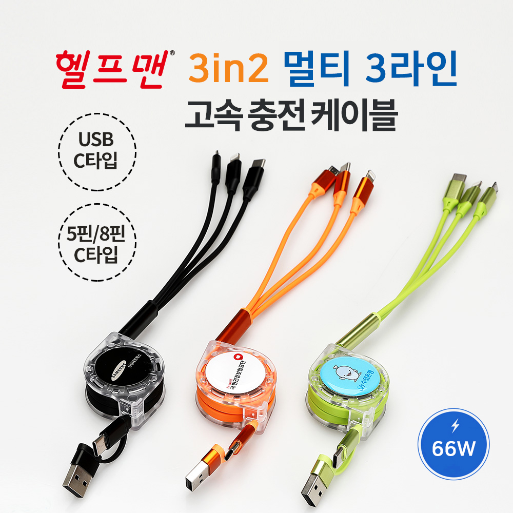 [헬프맨] 멀티 3라인 3in2 고속충전케이블 66w (충전전용) 1P